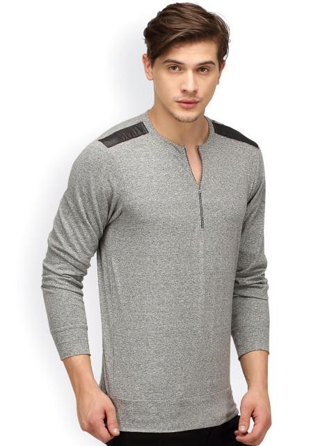 Grey T-shirt, has a notched round neck, brief zip closure, lengthy sleeves.